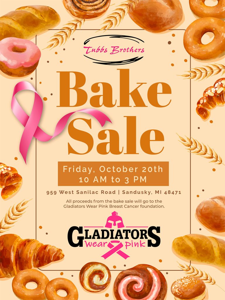 One of the many fundraising events Tubbs Brothers has planned for the month of October is a BAKE SALE on Friday, October 20, 2023, from 10 AM to 3 PM. All proceeds from the sale will go to the Gladiators Wear Pink Breast Cancer Foundation.