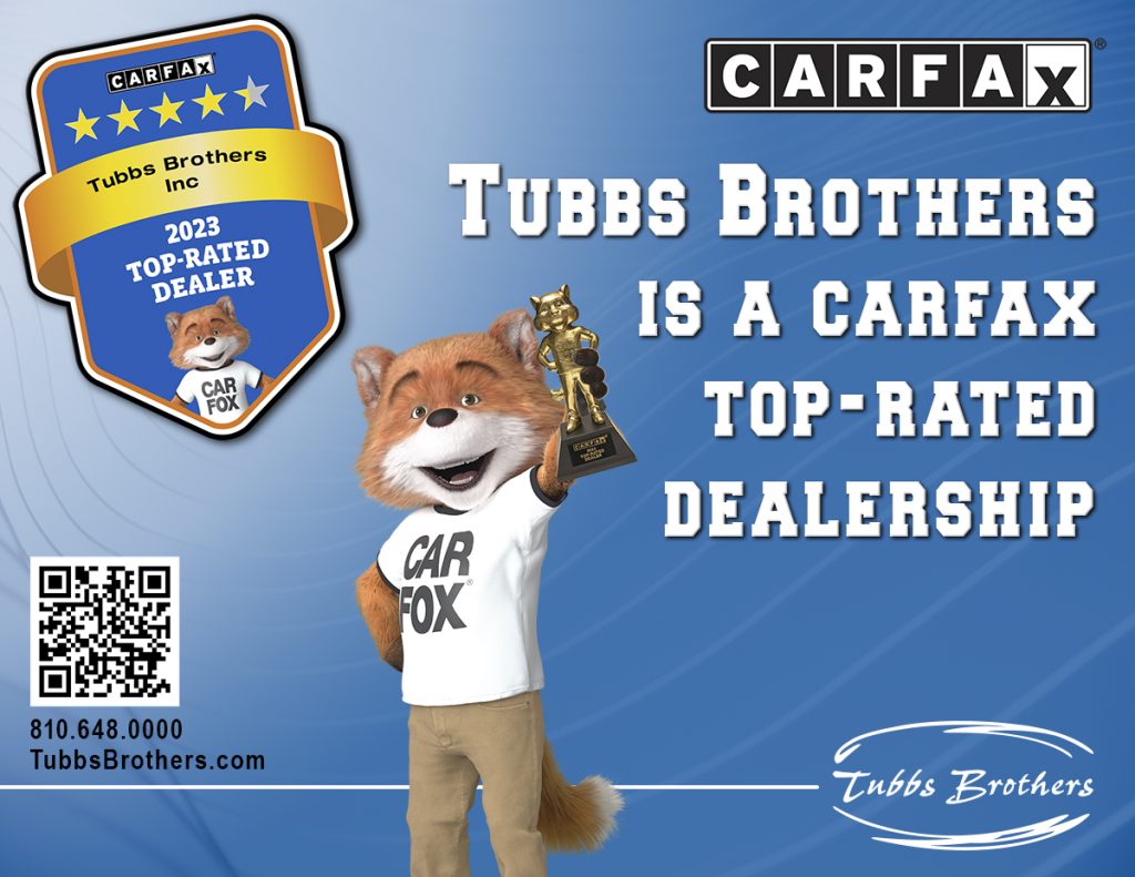 Tubbs Brothers has earned the distinction of a 2023 CARFAX Top-Rated Dealership! CARFAX Top-Rated Dealer Awards Are Based on Verified Customer Ratings. This is the fifth year CARFAX is honoring dealerships around the U.S. for their exceptional service based on verified customer reviews. The CARFAX Top-Rated Dealers received an average of at least 4.7 stars out of a possible 5.